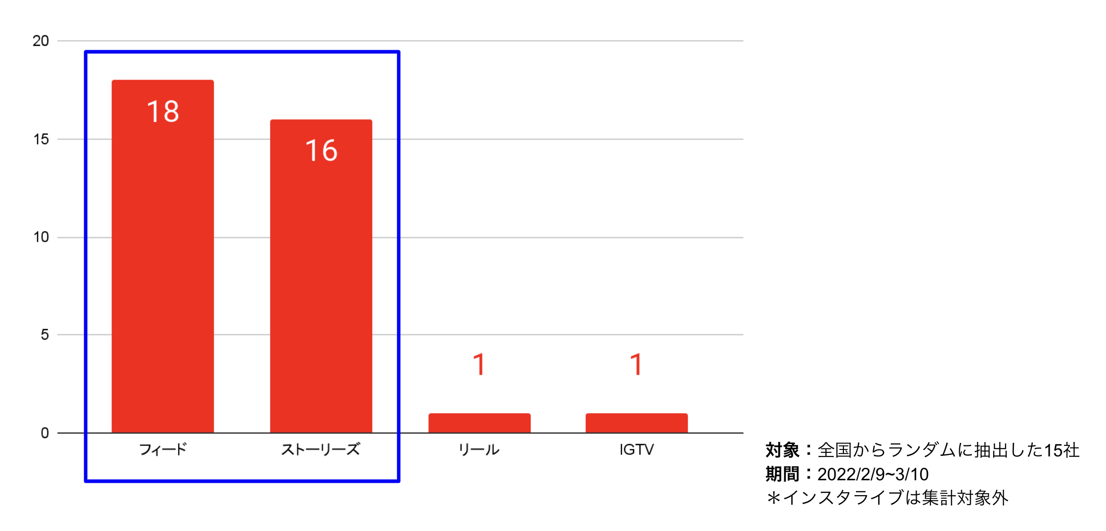 フィード投稿は月に18回、ストーリーズは月に16回の更新で各社こまめに更新することを心がけているようです。