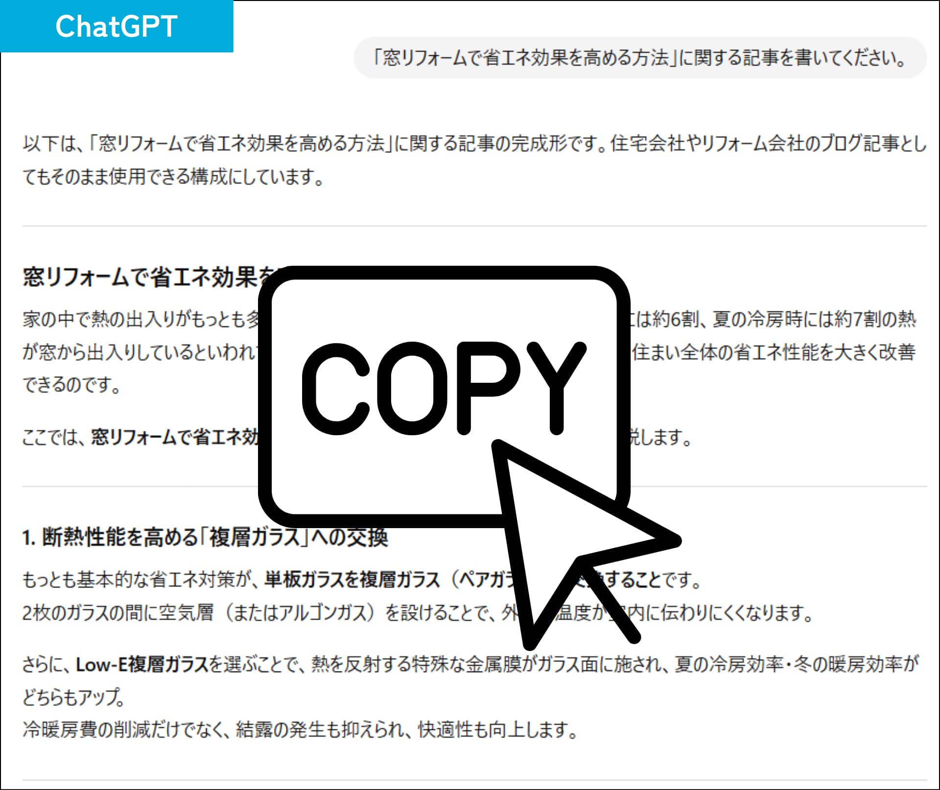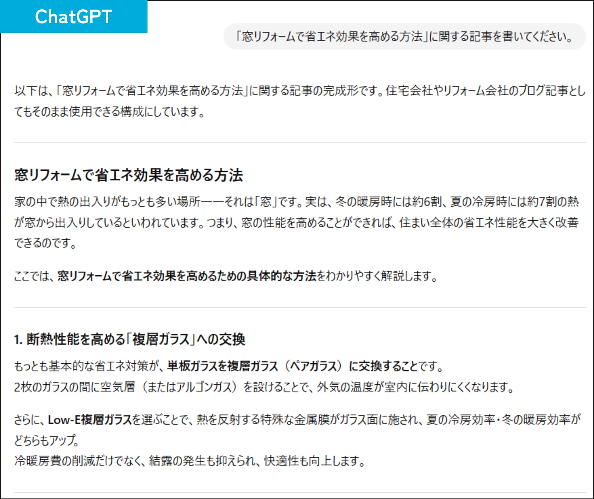 しかし、AIを使って「窓リフォームで省エネ効果を高める方法に関する記事を書いてください。」と命令すれば、それらしい記事が住宅のプロでなくとも書けてしまいます。