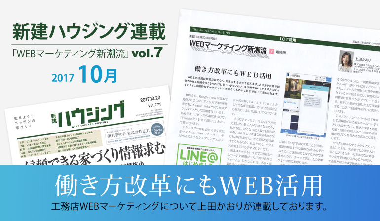 | 2017/10/20 | 連載:新建ハウジングタブロイド判「WEBマーケティング新潮流」 vol.7「WEBで実現する働き方改革」 ![]() |